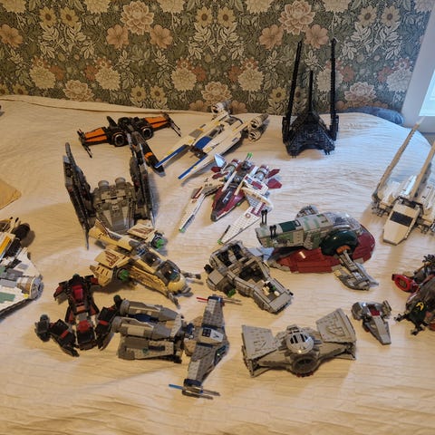 LEGO Star Wars byggsats med flera minifigurer och rymdskepp. Setet inkluderar olika karaktärer från Star Wars-universumet och är avsett för barn och samlare.