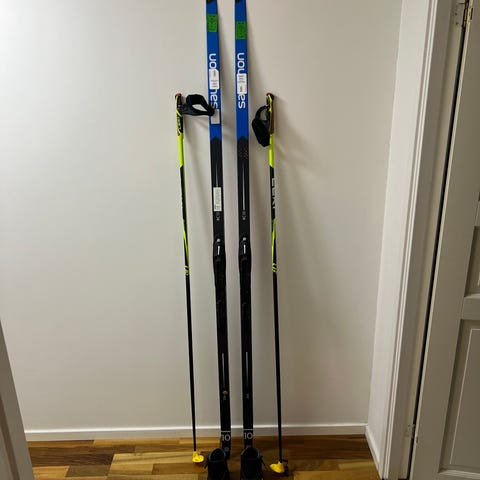 Fischerskidor 205 cm CS racing Classic med Salomonbindningar, Swix CT5 155 cm Compositstavar och Salomonpjäxor strl 43 1/3 eller 27.5 cm. Snabbsnörning & snöskydd.