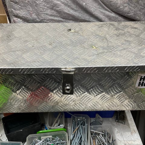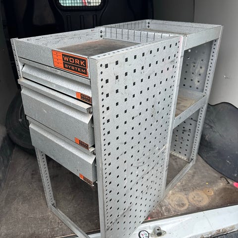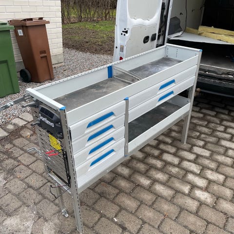 Metallverktygsskåp med flera lådor och öppna hyllor från work system. Har suttit i en Ford custom. Fungerar fint, har bara lite skönhets-skavanker.