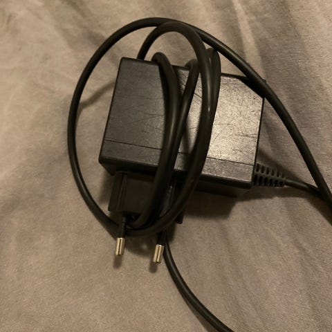 Nintendo laddare i svart färg. Används för att ladda kompatibla Nintendo-enheter. Kommer med sladd och kontakt för eluttag.