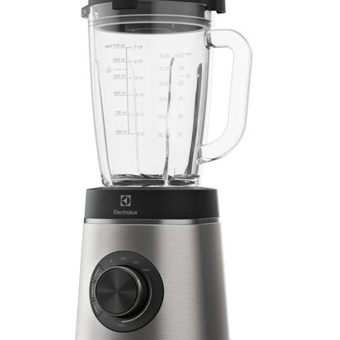 Electrolux blender med svart bas och transparent kanna. Utrustad med strömbrytare och sladd för anslutning till eluttag. Passar för blandning av olika ingredienser i köket.