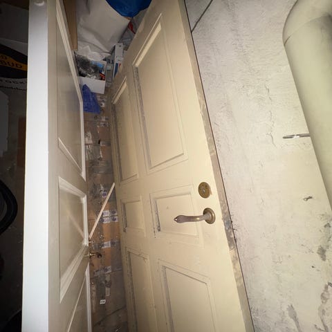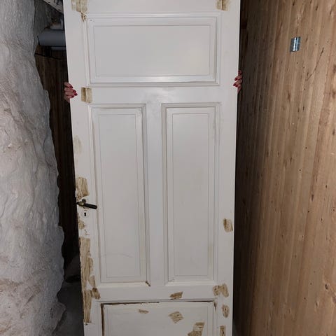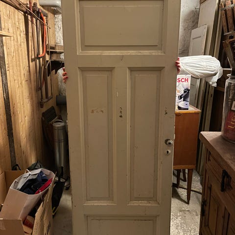 Enkel dörr utan karm, sekelskifte, från Östermalm. Tre speglar på båda sidorna. Ena sidan har en tunn sågspånsskiva över som kan tas bort innan man fixar upp dörren. Nyckel finns till låset på dörren.