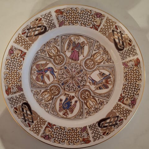 Inger Waage Stavanger keramiktallrik med motiv av Hirtsals. Tallriken är dekorerad med ett detaljerat motiv som föreställer en by med byggnader och människor. Designad av Inger Waage och tillverkad av Stavangerflint keramikk i Norge. 18 cm diameter