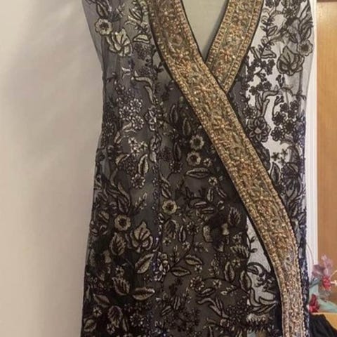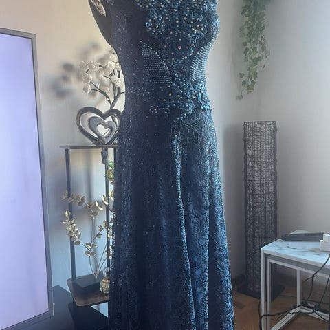 Axelbandslös klänning i storlek 36, med en rad strassstenar längs bystkanten. I nyskick, aldrig använd.