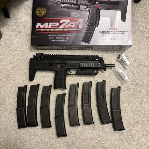 Geväret kommer komplett med alla originaltillbehör förutom bakre siktet, är det ett måste kan jag säkert hitta den också, laddare, batteri, bruksanvisning och original magasin, se bild 1.