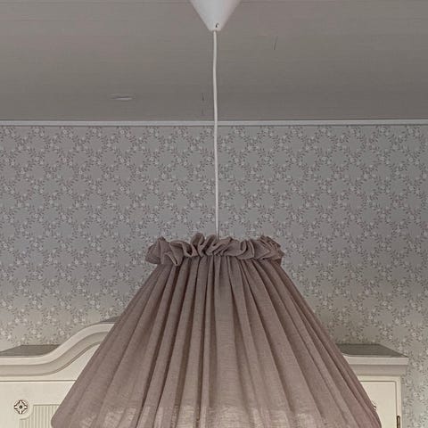 Vacker äldre/vintage taklampa med skärm i naturfärgat tyg med linnekaraktär. En harmonisk och nedtonad design som ger ett mjukt, stämningsfullt ljus och tillför värme till rummet.