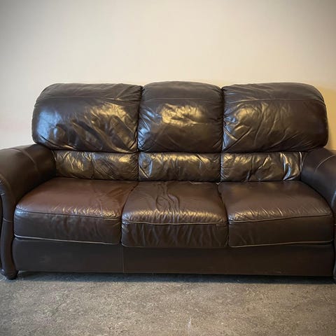 Svart skinnsoffa i bra skick. Kromade ben som går att höja och sänka.