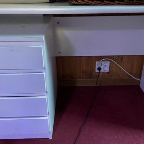 Vitt skrivbord från IKEA med en låda och fyra bra förvaringsfack vid sidan.