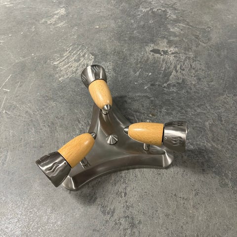 Taklampa i silver och trä med 3 spottar. Trehörnig design. Från markslöjd. Glödlampor ingår inte. Sista bilden visar knoppen som ska skruvas fast på undersidan av taklampan när den är monterad i taket.
