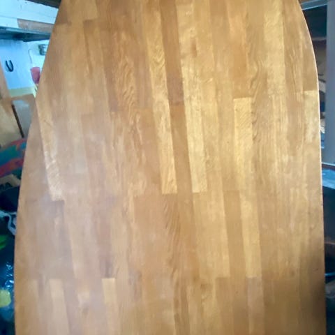 Massiv stavlimmad ek, ca 4 cm tjocka, i bra begagnat skick med normal patina. Har suttit i ett Lidhultskök.