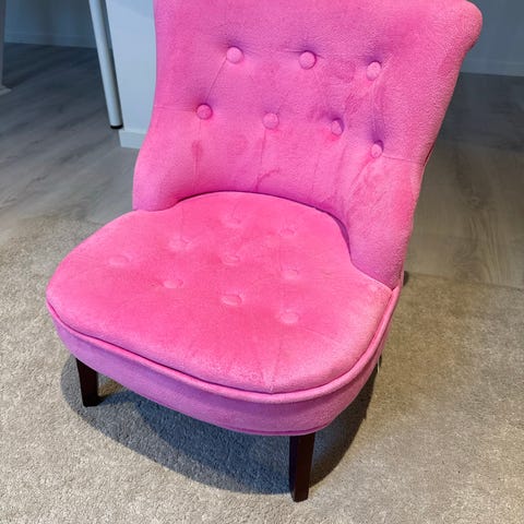 JLY Barnfåtöljer i rosa färg. Utfällbar dyna så att den även blir till en madrass. Avtagbar klädsel för att kunna tvättas. Har två små fläckar, se bild.