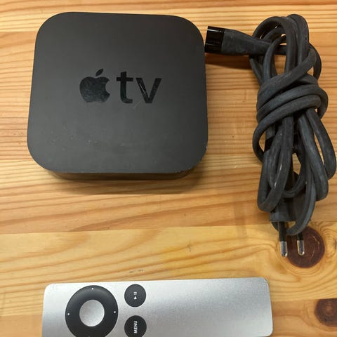 Apple TV mediastreamer med fjärrkontroll och strömkabel.