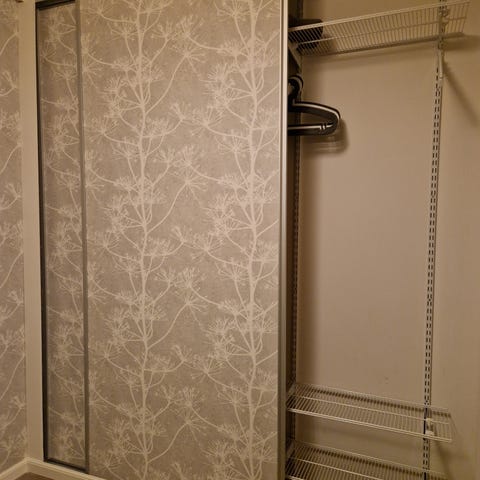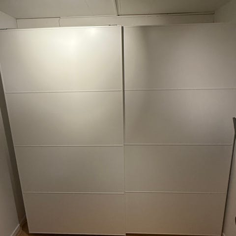 IKEA garderob med skjutdörrar i svart glas. Inredning med hyllor och lådor i ek.