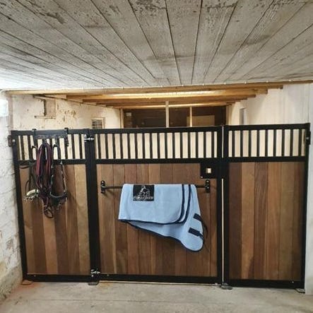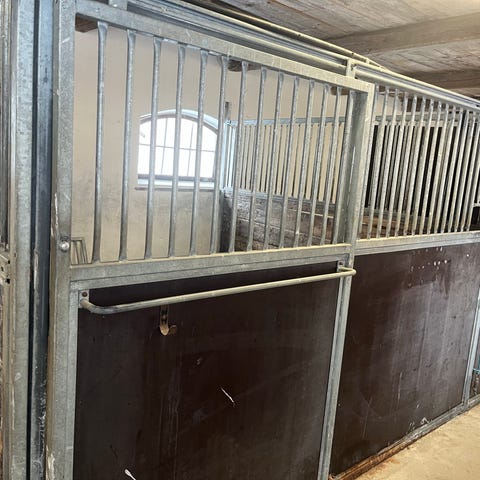 4 Stallboxar totalt . Väldigt fint skick . Mattorna inuti boxarna ingår i köpet . Smyckade med hästhuvuden i toppen på alla boxar