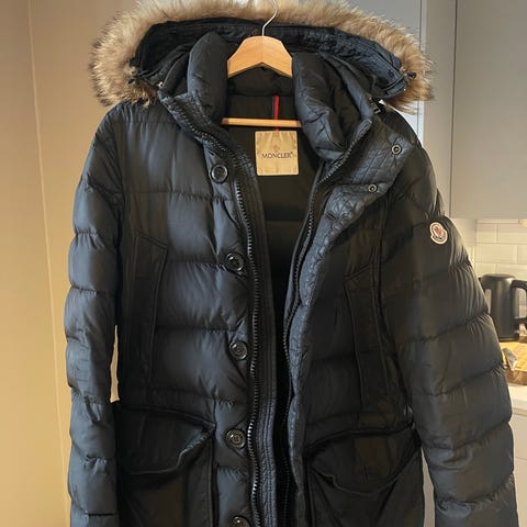 Moncler jacka i storlek M, blå färg och tillverkad i dunmaterial. Jackan är avsedd för herrar och har en vadderad design som ger isolering och värme.