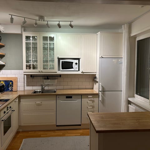 Vitmålat kök från Marbodal med pushup luckor på överskåp i frostat glas. Kyl och frys. Mikro och ugn.