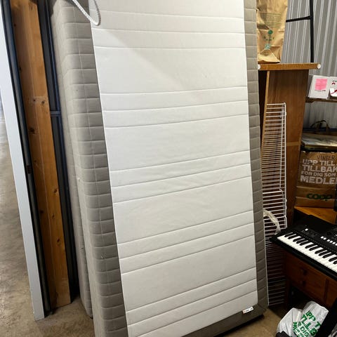 IKEA SKÅRER madrass (beige och vit). Resårbottenmadrass. Ben ingår inte, men IKEAS modeller monteras enkelt. Madrassen är använd av vår dotter i ca ett år. Vi har katt i hushållet. Madrassen är tvättad med bikarbonat och ättika. Det går möjligtvis att ana en nyansskillnad på ett ställe där det tidigare varit en fläck.
