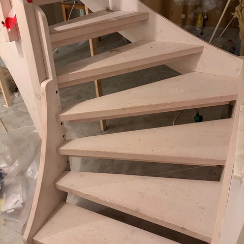Trapp med trästeg och metallram, designad för att spara utrymme. Stegen är av trä och ramen är av metall. Anti-halktejp på trappstegen. Passar för inomhusbruk och små ytor där en kompakt trappa krävs. Perfekt till sovloft.