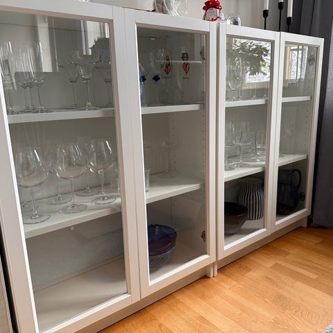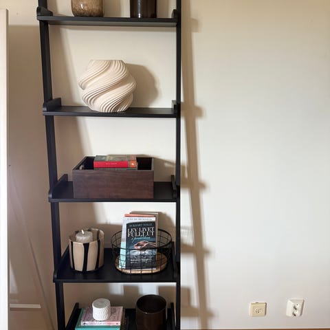 IKEA bokhylla i svart metall med flera hyllplan. Passar för förvaring och organisering av böcker, dekorationer eller andra föremål i hemmet eller kontoret. Ev billigare vid mycket snabb affär