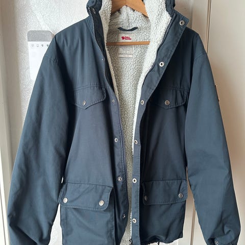 Klassisk friluftsjacka från Fjällräven med det rätta utseendet och känslan. Infälld kapuschong med dragsko i kragen. Två framfickor och två bröstfickor- Dragsko i midjan och i nederkant på jackan.