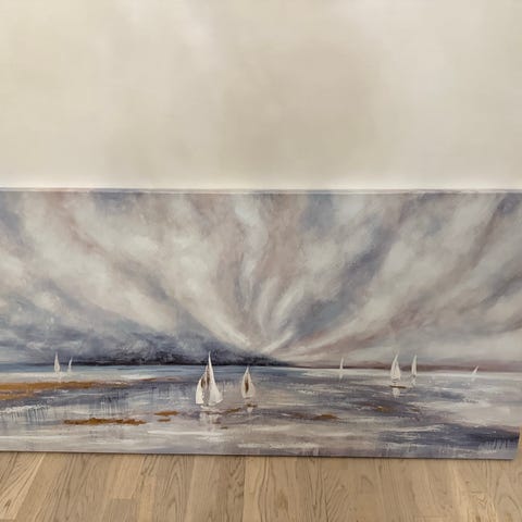 Oljemålning föreställande ett havslandskap med flera båtar och en horisont med himmel och moln. Målningen är inramad i en guldfärgad ram.