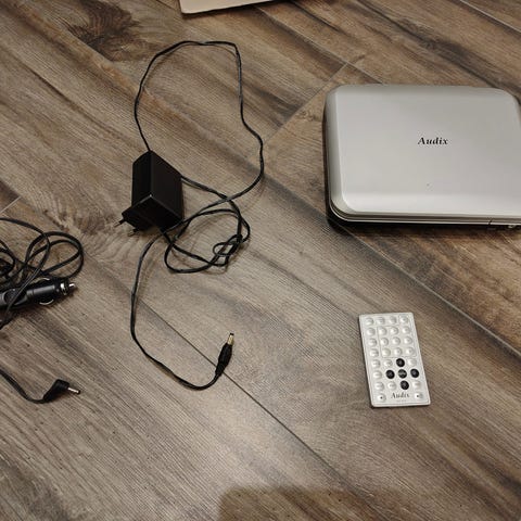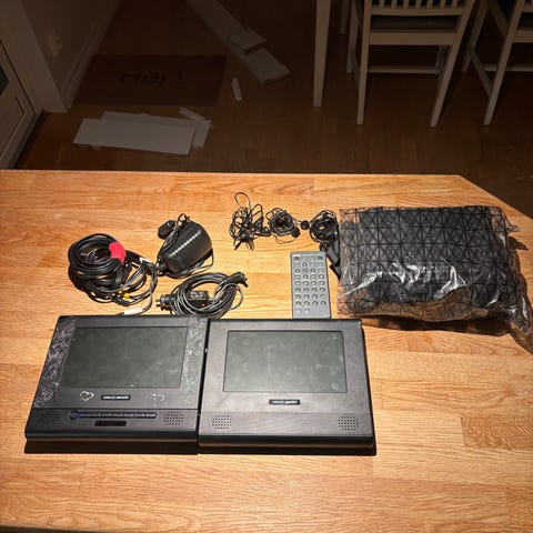 Portabel DVD-spelare med två skärmar för bil som fästes på framsätets nackstöd. Huvudskärmen fungerar bra men vet inte hur man synkar med andra skärmen. DC Out sladd för tändar-uttag kommer med men kan inte kolla om den fungerar eftersom jag inte har en sånna bilen. Annars kan man köpa till en på Elgiganten etc. AV in och AV out för koppling mellan skärmarna följer med. Dumbo-dvd från Disney följer med.