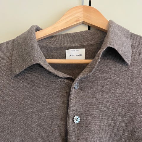 A Day's March polotröja i beige färg, tillverkad i 100% merinoull. Tröjan är i storlek M och är avsedd för män. Materialet är mjukt och andas, vilket gör plagget lämpligt för olika tillfällen och årstider.
