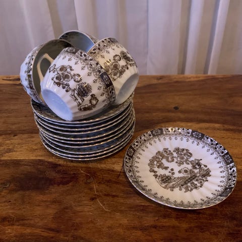 Royal Copenhagen porslinsservis med blå blomsterdekor. Innehåller 7 assietter, 12 st kaffekoppar med tillhörande fat, en stor tallrik samt en liten mjölkkanna.