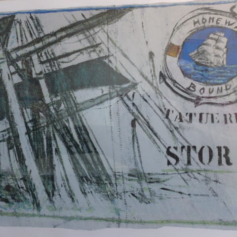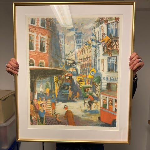 Gösta Petersson litografi föreställande en trana, numrerad 126 av 200 exemplar. Konstverket är inramat och visar en trana i flykt över ett landskap med vatten och himmel i bakgrunden.