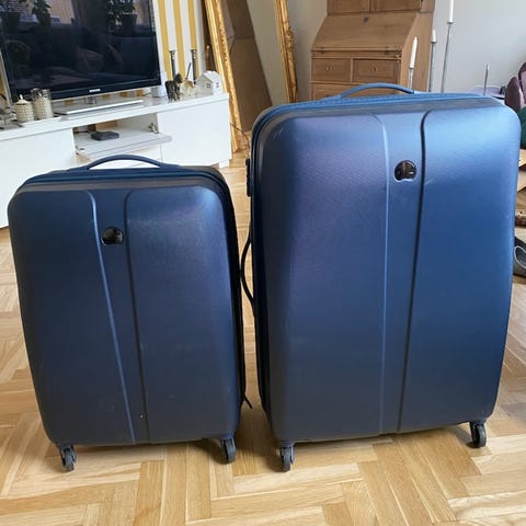 Delsey resväska tillverkad i plast. Resväskan har 4 hjul. Den övre handtag saknas, den andra (på sidan tejpad, men funkar). 1 hjul roterar lite svårare, men andra funkar perfekt. Hämtas på Östermalm. Mått 79cmx 50cm x 32 (eller 37) cm. Det går att öppnas dragskedja runt om resväskan ha den större (+ 5cm extra).