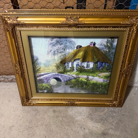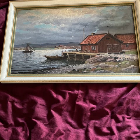 Landskapsmålning föreställande en sjö med båt och hus i bakgrunden. Målningen är inramad med en grå och silverfärgad ram.
