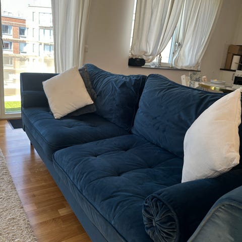 Fin 2-sits soffa i blått blommigt tygmönster till den mindre lägenheten eller som extra sittplats. Har skyddats med överkast (se bild). Sittdjupet är ca 54 cm. Sitthöjd ca 43 cm. Endast avhämtning.