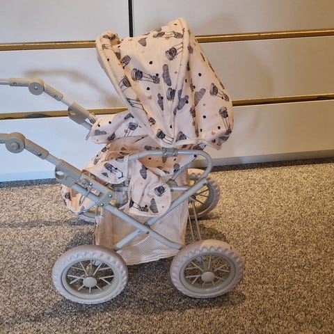 Dockvagn med både ligg och sittdel plus bilbarnstol. Svängbara däck. Perfekt för alla dockor. Man kan välja om dockan är en nyfödd i liggdel eller lite större så gör man om den till sittdel.