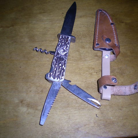 Säljer en klassisk fällkniv Rostfrei (Tyskland) med flera praktiska funktioner. Kniven har ett stabilt blad samt extra verktyg som korkskruv och kapsylöppnare.