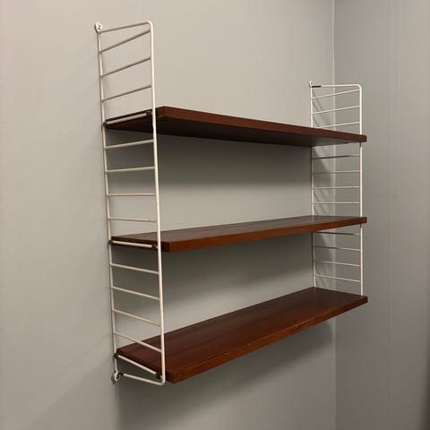 Säljer ett original String-system i teak, både hyllplan och gavlar/stringar, perfekt för dig som vill bygga en klassisk Stringhylla med genuin 50–60-talskänsla. Passar lika bra i vardagsrum, arbetsrum, sovrum eller som större förvaringslösning.