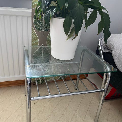 2 stycken svarta sängbord i metall med en svart finish och dekorativa mönster i övre delen och glasskiva. Pris 200 kr för båda.