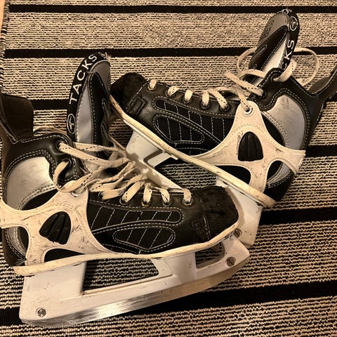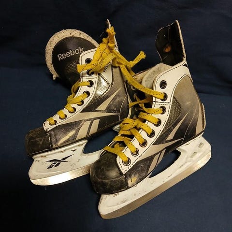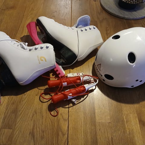 Vi säljer flera par skridskor, hjälmar och en ishockeytrunk, allt i mycket gott skick. Skridskorna behöver slipas, men är sparsamt använda i övrigt.