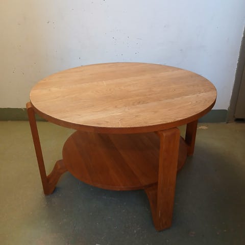 Runt soffbord i trä med en stabil bas och rund bordsskiva. D65 H 49cm