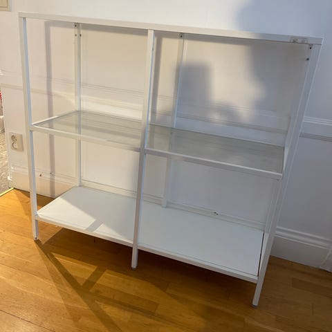 Svart hylla i metall och glas.