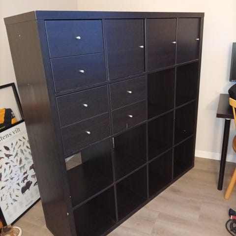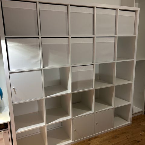 Begagnad, har ett par hål som syns på bilderna. Svarta tyglådor medföljer om man vill, ett par går inte att fälla ihop som de ska men funkar att använda.
