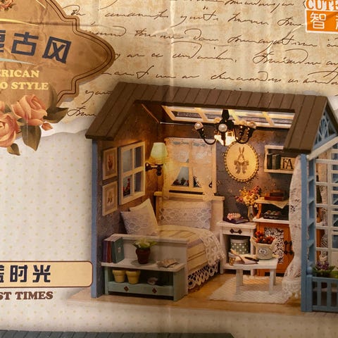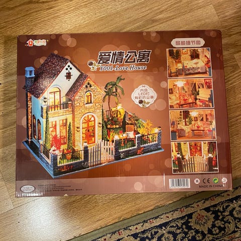 Byggsats för modellhus med tropiskt tema inklusive palmträd, hus, och andra detaljer. Setet innehåller delar för att bygga en liten scen med strand- och havsmotiv. Instruktioner för montering med tydliga steg för steg beskrivningar