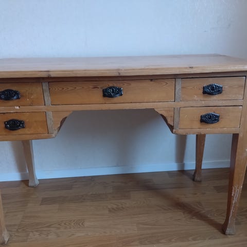 Äldre skrivbord i massivt trä säljes. I rätt bra skick, översidan är inte iordningställd då det varit dekorplast på där. 2 lådor, dock ingen nyckel till.