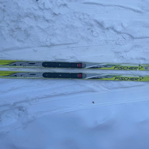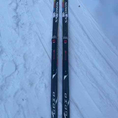 Längdskidor barn, använda en gång, nyskick. Passande stavar till, längd 95 cm. Säljer även ett par lika fina stavar, längd 80 cm.