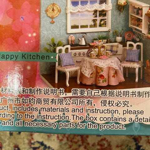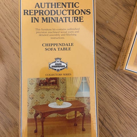 DIY Miniatyrhus Modell Kit i trämaterial. Innehåller delar för att bygga ett detaljerat litet rum med möbler och dekorativa element. Passar för hobby och modellbygge.