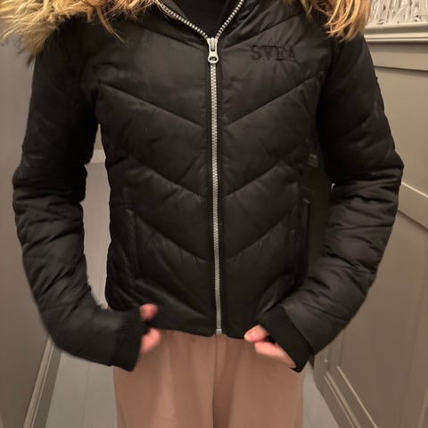 Sveajacka i storlek 160. Jackan har luva och är vadderad för extra värme.