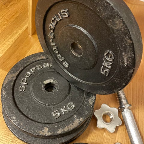 En hantel för styrkelyftning, går att plocka bort brickorna. Inklusive 2st stopp för brickorna.