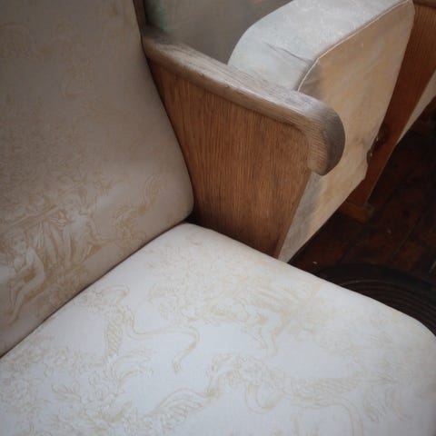 Två ihopsittande stolar i trä som fälls ner. Fint vintage-skick.