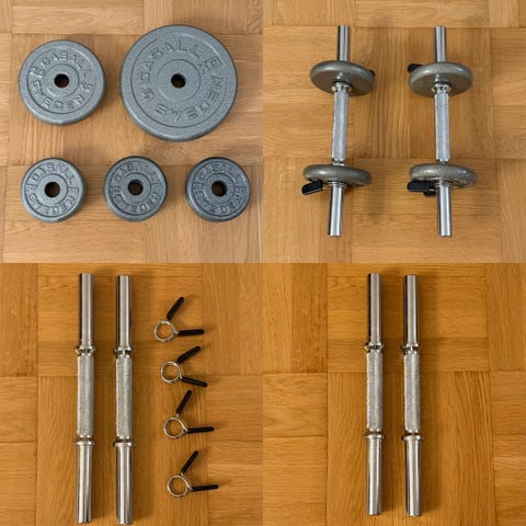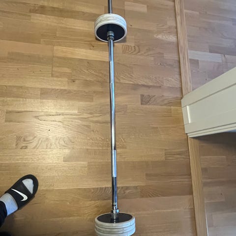 Situps bänk, rygg rullare, vikter för ben och skivstång med vikter