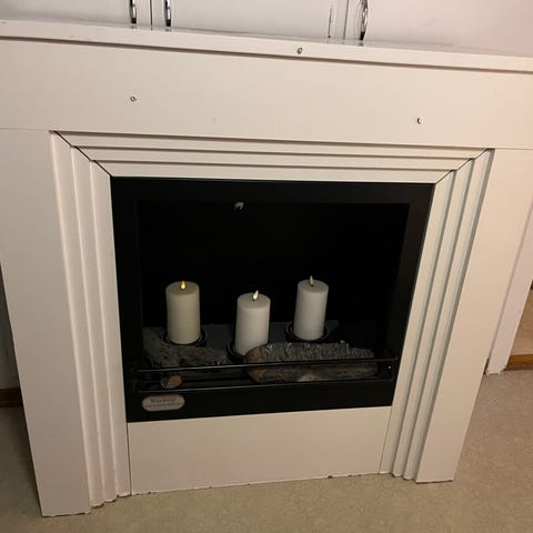 Hörnskåp med eldstadsdekor i vitt med träfärgad top. Skåpet är utformat för att passa i ett hörn och har en dekorativ eldstadsinsats med vedkonstruktion. Lampan i skåpet lyser med ett flammande sken så att det ser ut som en liten öppen spis.