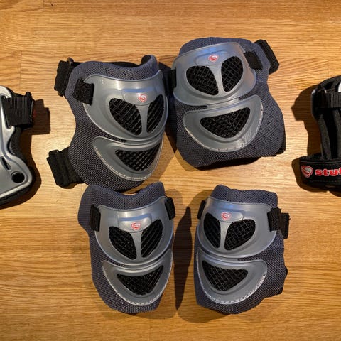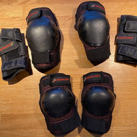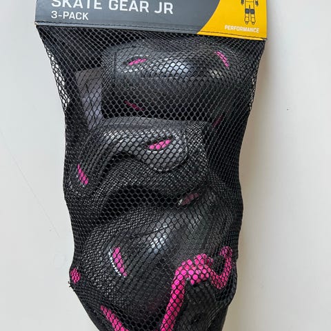 Skydd till knän, armbågar och händer. Färg rosa och vit. Används för rullskridskoåkning och inlines.
